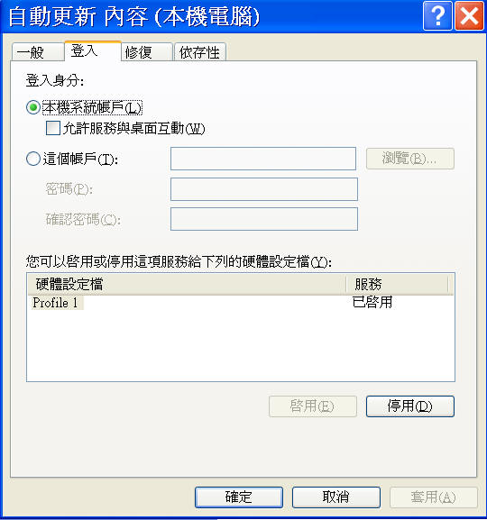- 點選「登入」這個頁籤,先確認目前登入身分為「本機系統帳戶(L)」,而且不勾選底下的「允許服務與桌面互動(W)」。接著再確認「Automatic Updates」這項服務已在目前的「硬體設定檔」中被啟用,若未啟用,則按下「啟用」鍵。