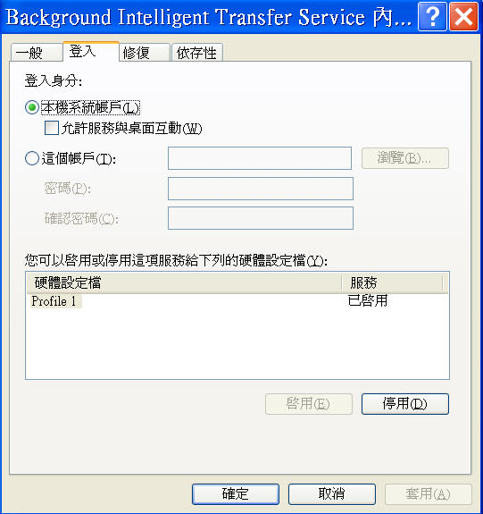 - 點選「登入」這個頁籤,先確認目前登入身分為「本機系統帳戶(L)」,而且不勾選底下的「允許服務與桌面互動(W)」。接著再確認「Background Intelligent Transfer Service」這項服務已在目前的「硬體設定檔」中被啟用,若未啟用,則按下「啟用」鍵。